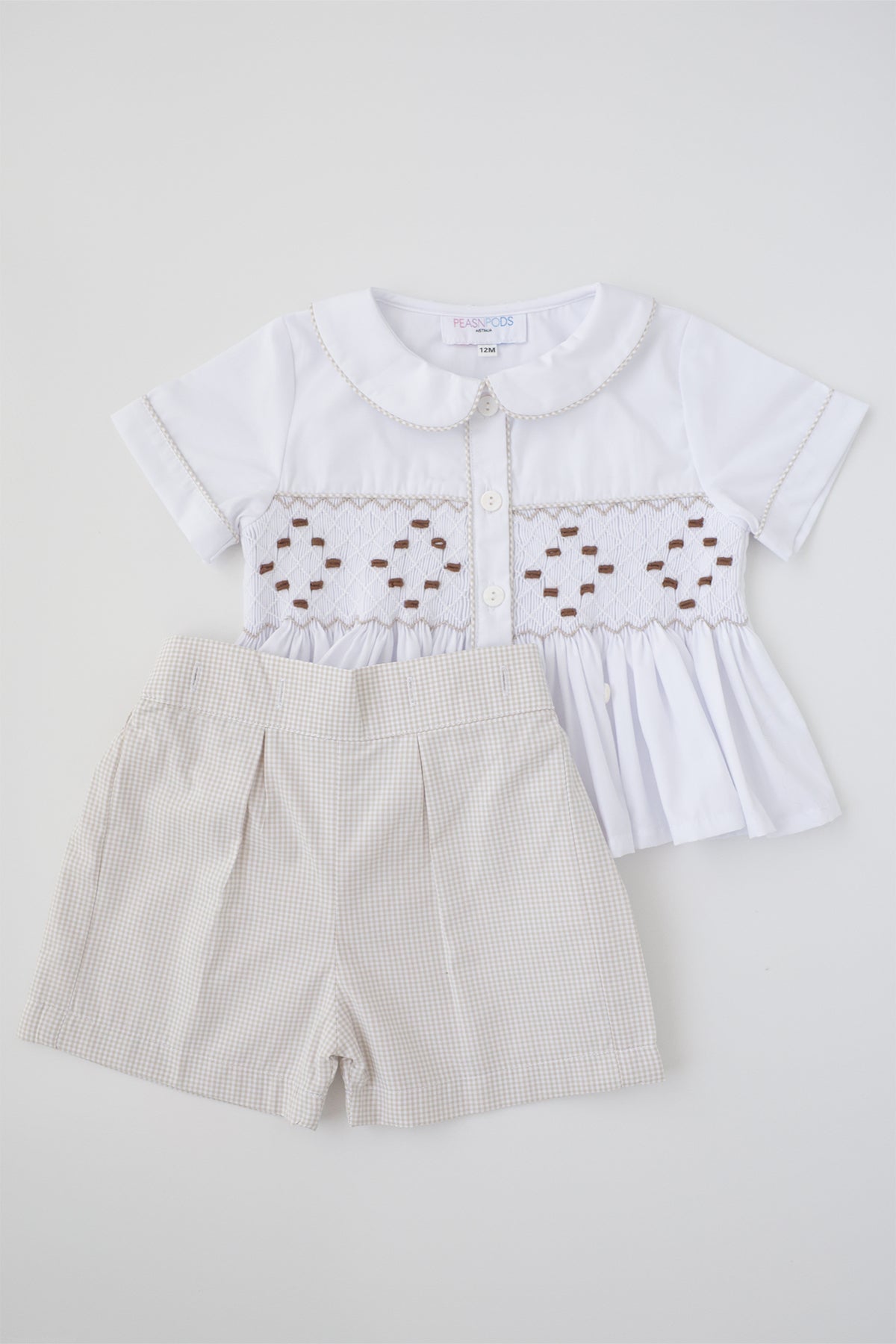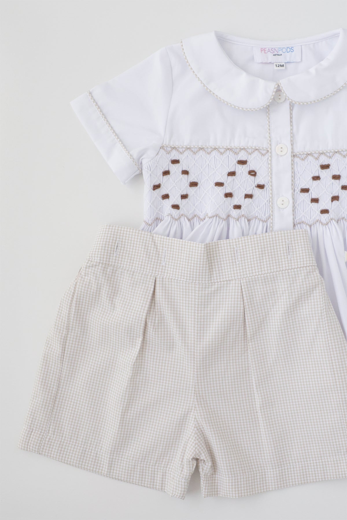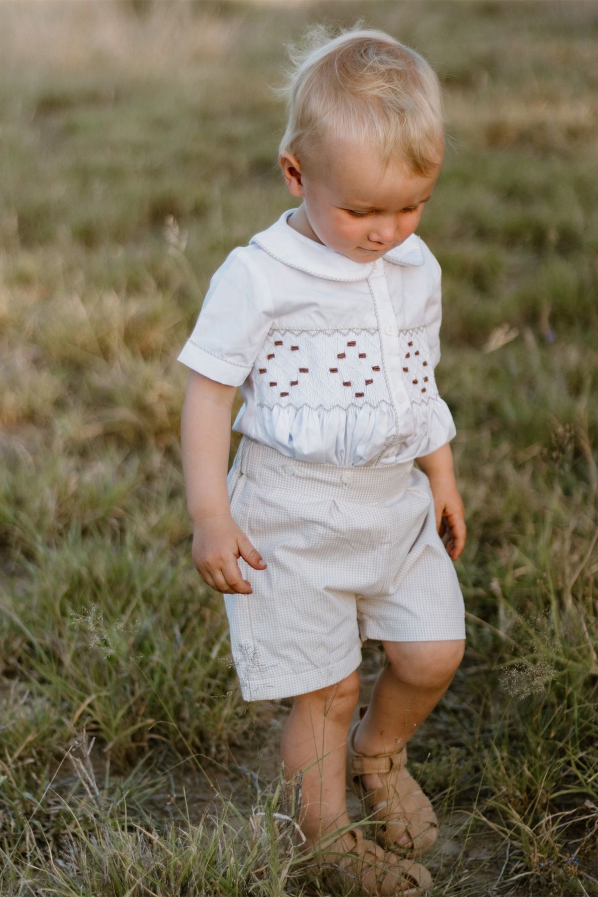 the George Gingham Boys Set features a classic white shirt with delicate handsmocked details and matching gingham piping, paired with soft light brown gingham shorts. Crafted from 100% cotton and fully lined for comfort, this set offers effortless style for special occasions or everyday wear.