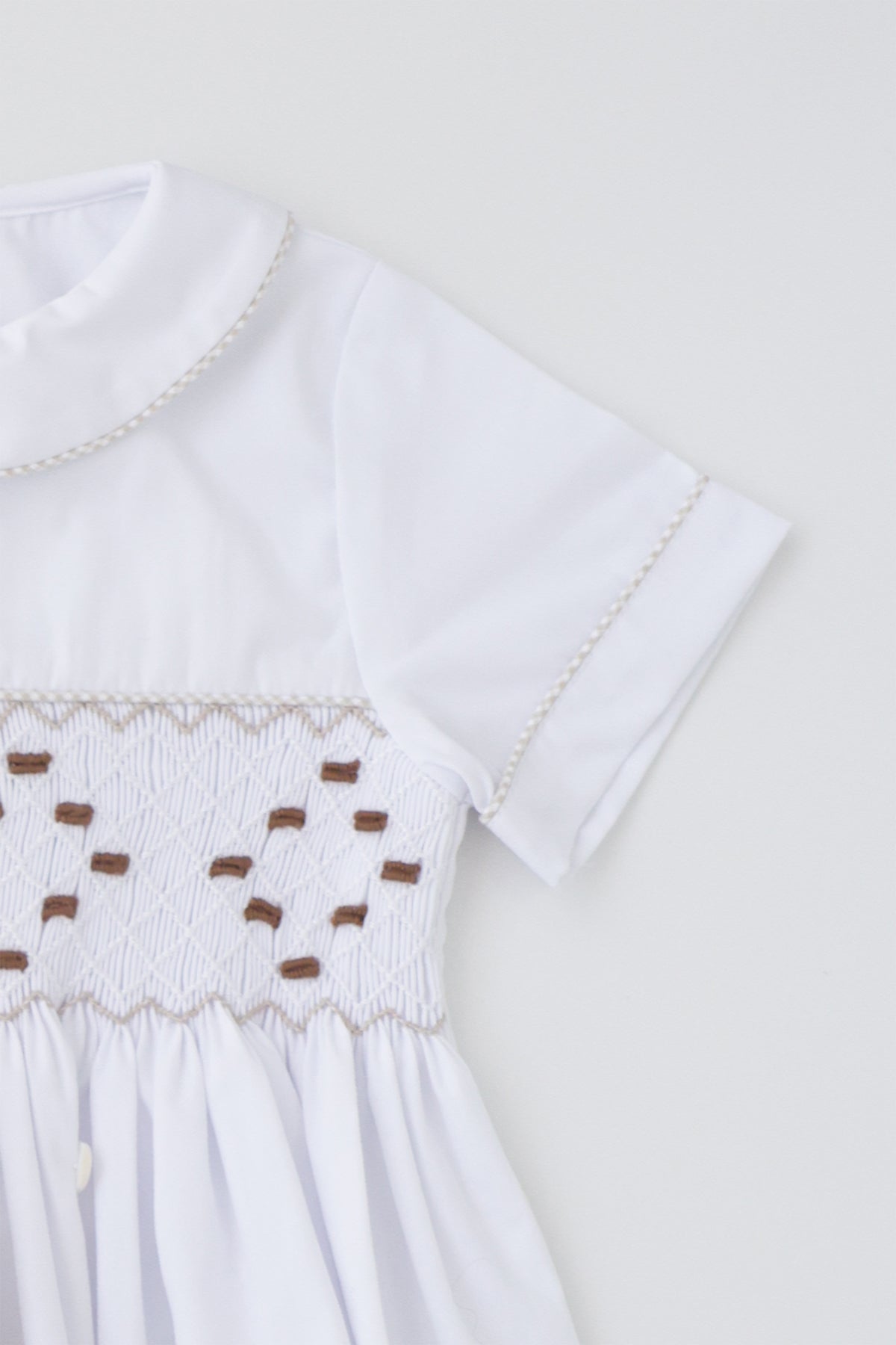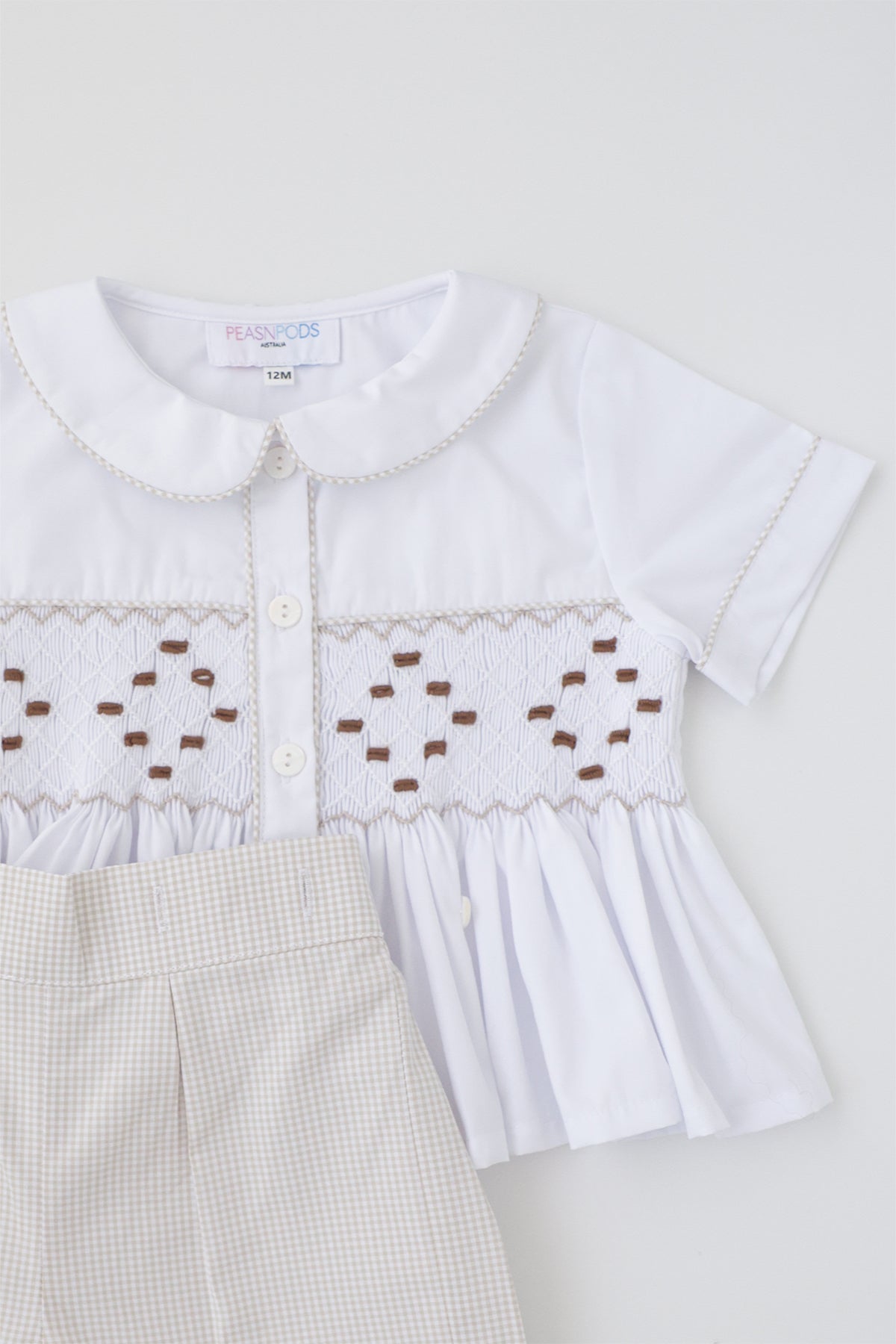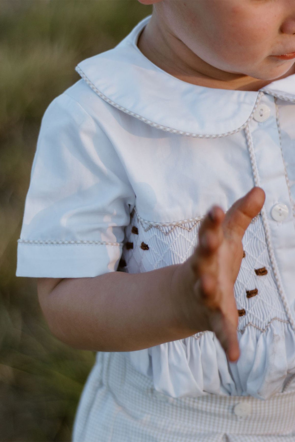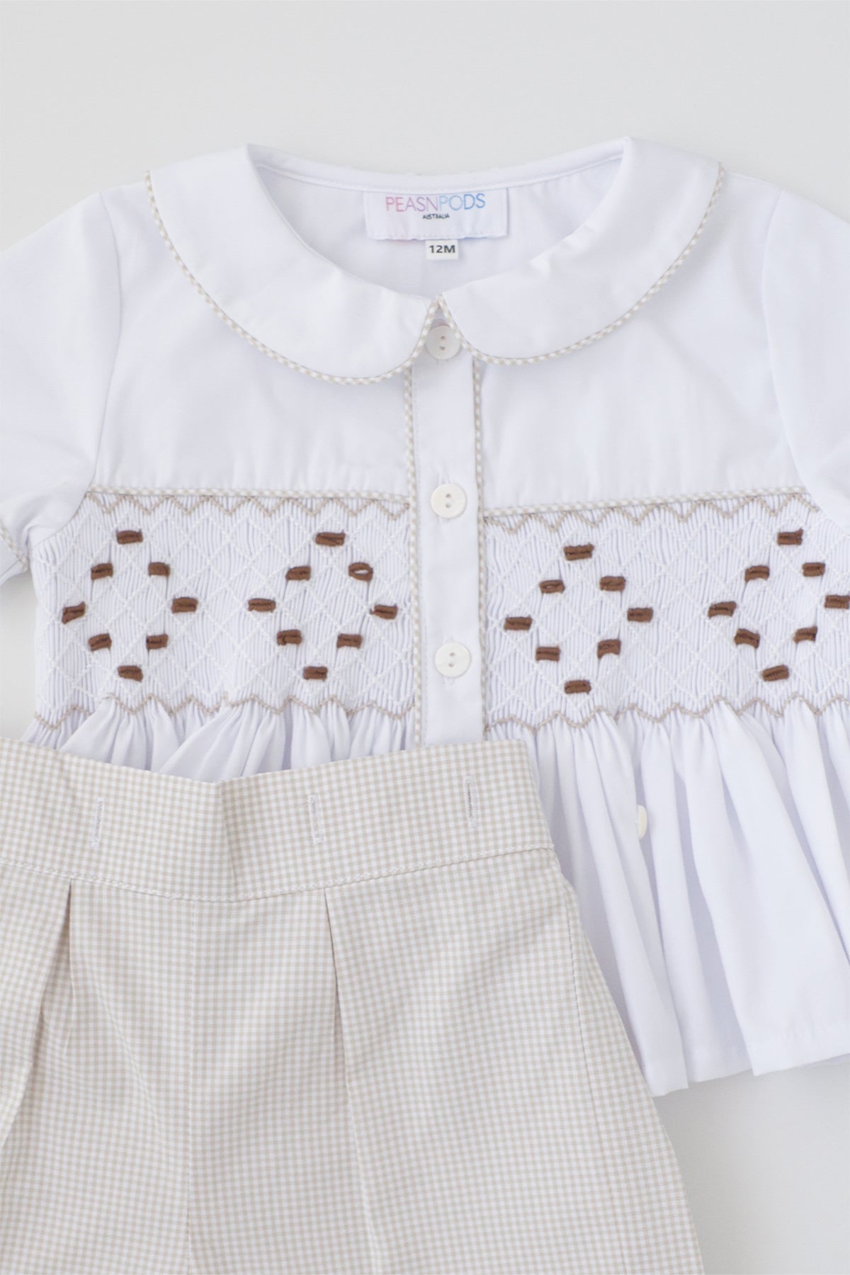 the George Gingham Boys Set features a classic white shirt with delicate handsmocked details and matching gingham piping, paired with soft light brown gingham shorts. Crafted from 100% cotton and fully lined for comfort, this set offers effortless style for special occasions or everyday wear.