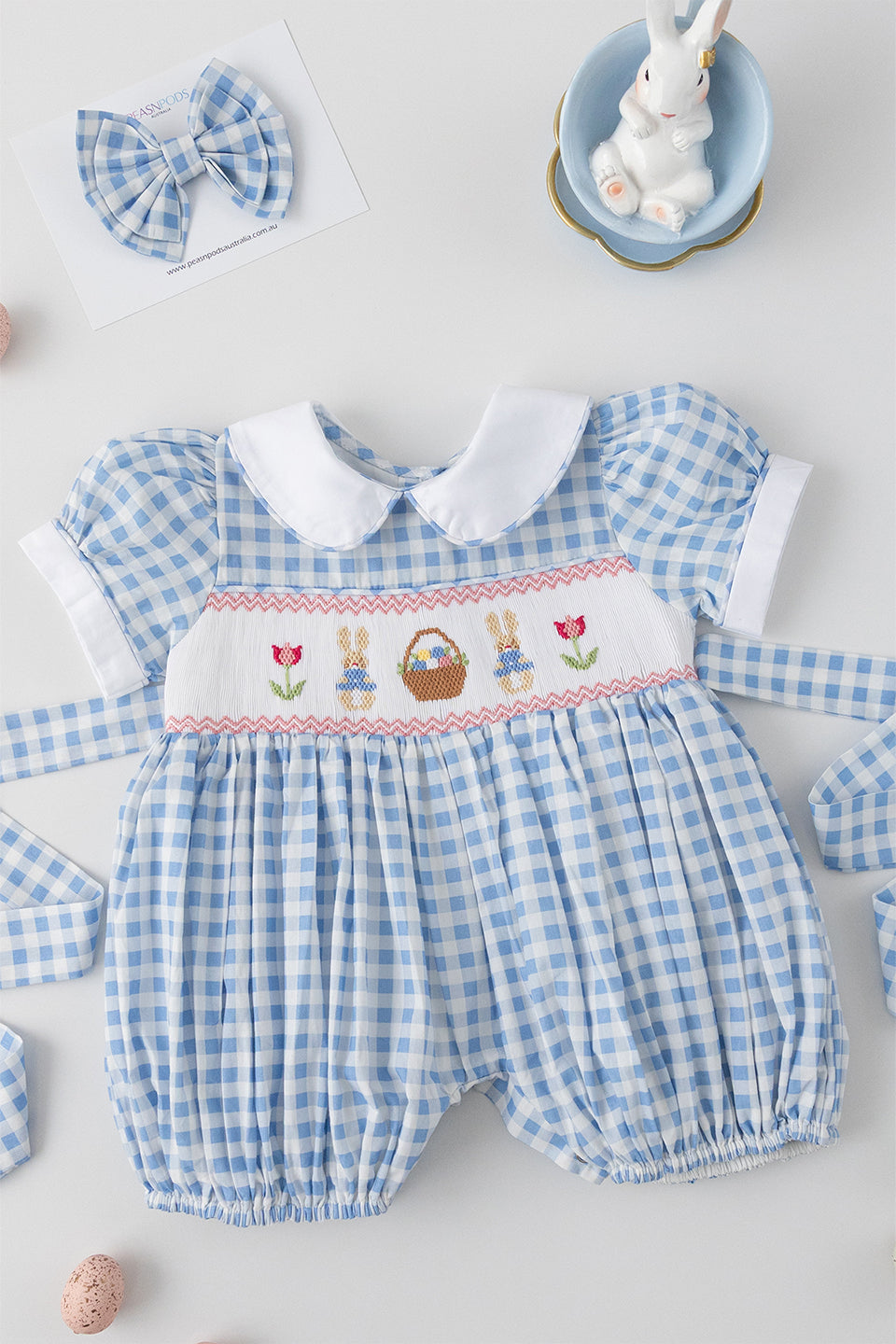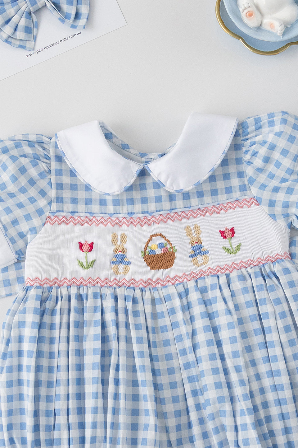Handcrafted Excellence: It's important to note that every Peasnpodsaustralia garment is lovingly handcrafted with intricate hand-smocking and hand-embroidery techniques. As a result, detailing and appliqué placement may vary slightly between pieces. This uniqueness is not considered a defect but rather a beautiful hallmark of hand-crafted goods.
