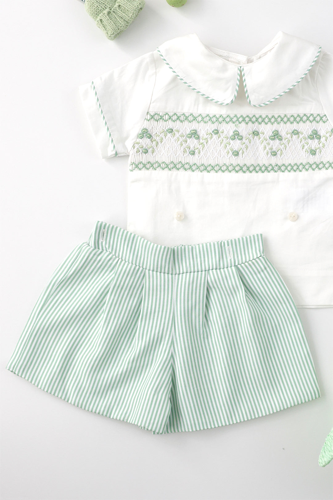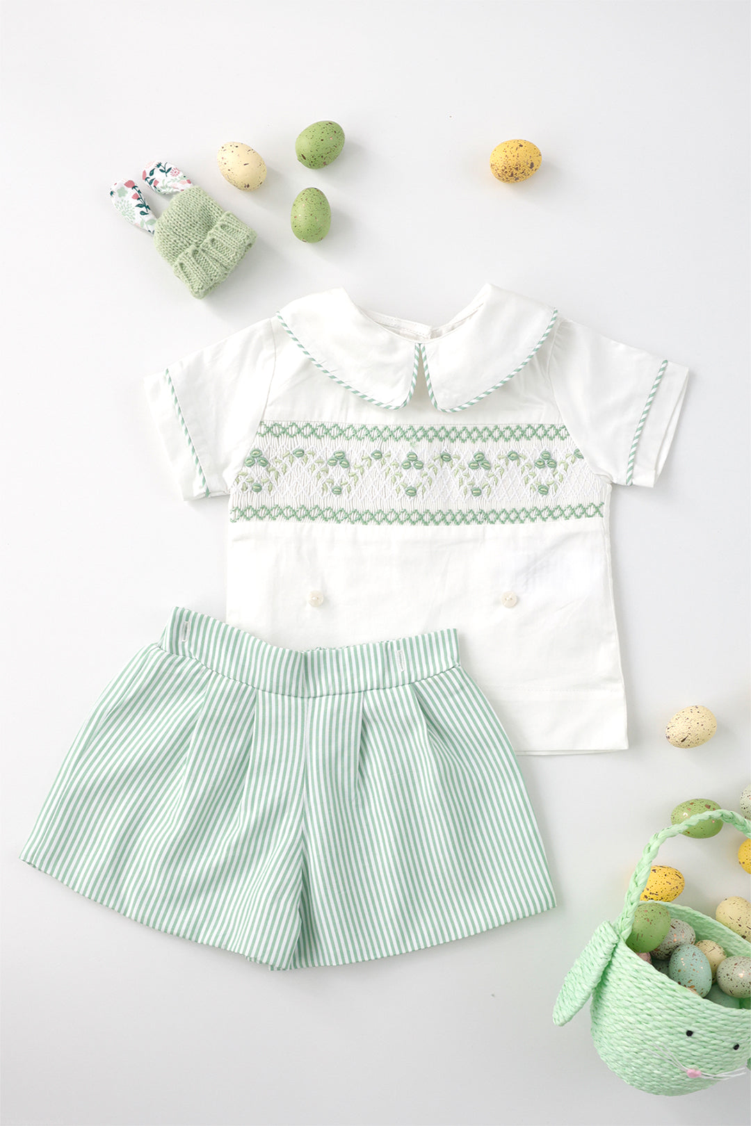 The Green Stripe Boys Set features a classic white shirt with delicate green handsmocked details and coordinating green stripe piping, paired with green stripe shorts. Crafted from 100% cotton and fully lined for comfort, this set offers effortless style for Easter celebrations, special occasions, or everyday wear.