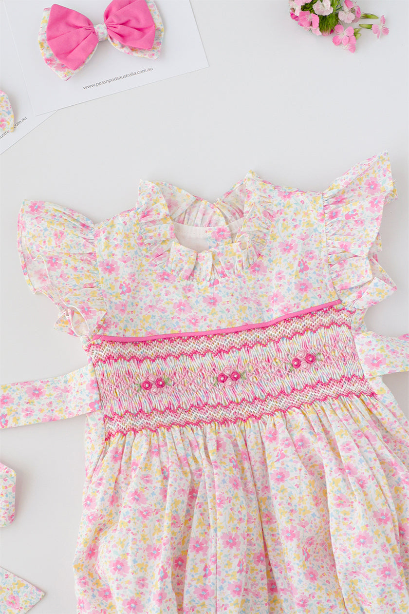 A charming pink and yellow floral hand-smocked romper featuring a frill collar, frill sleeves, and pink piping above the smocked bodice. The handsmocked bodice includes delicate embroidered floral details. Fully lined for comfort and finished with a sash to tie at the back.