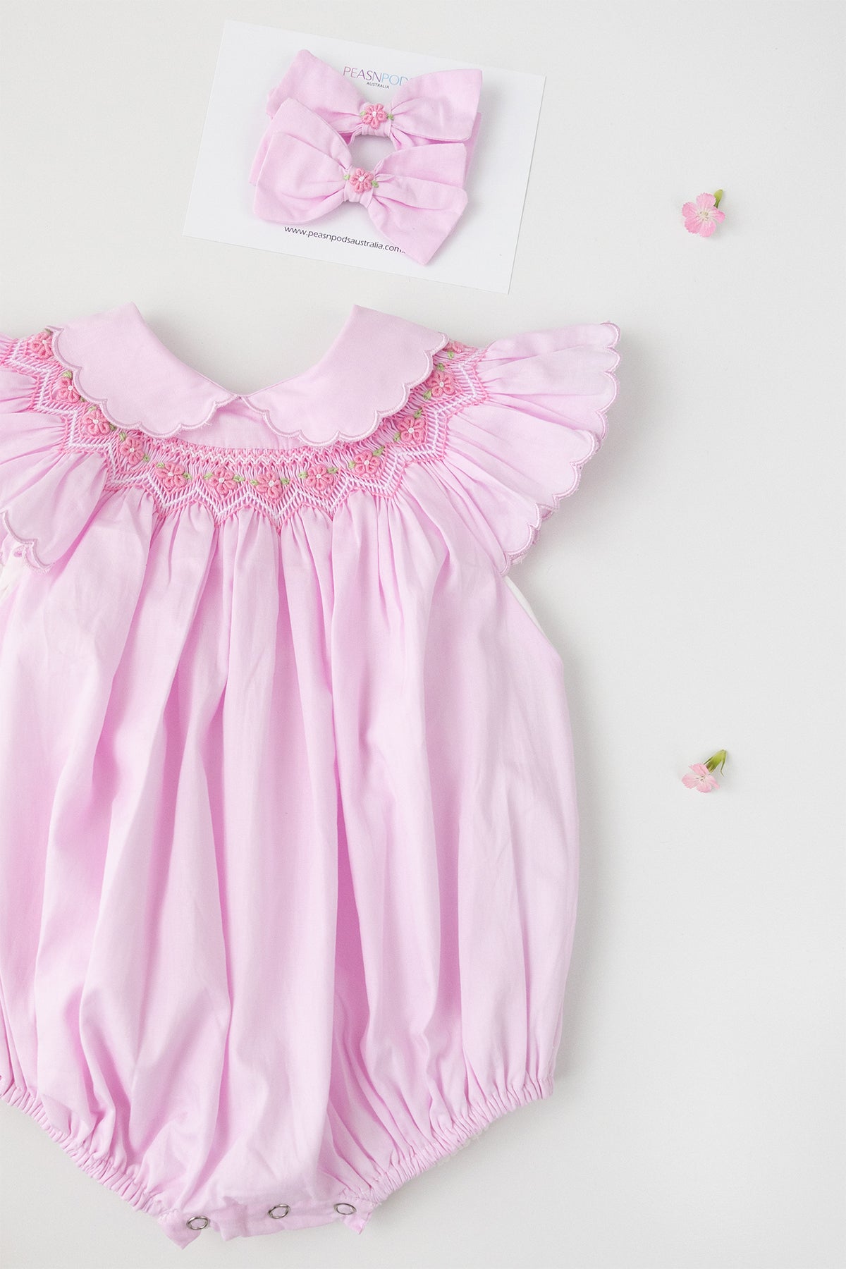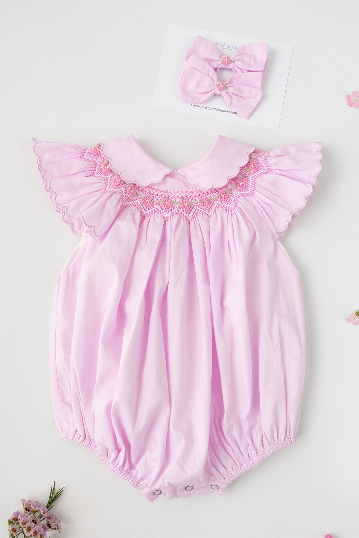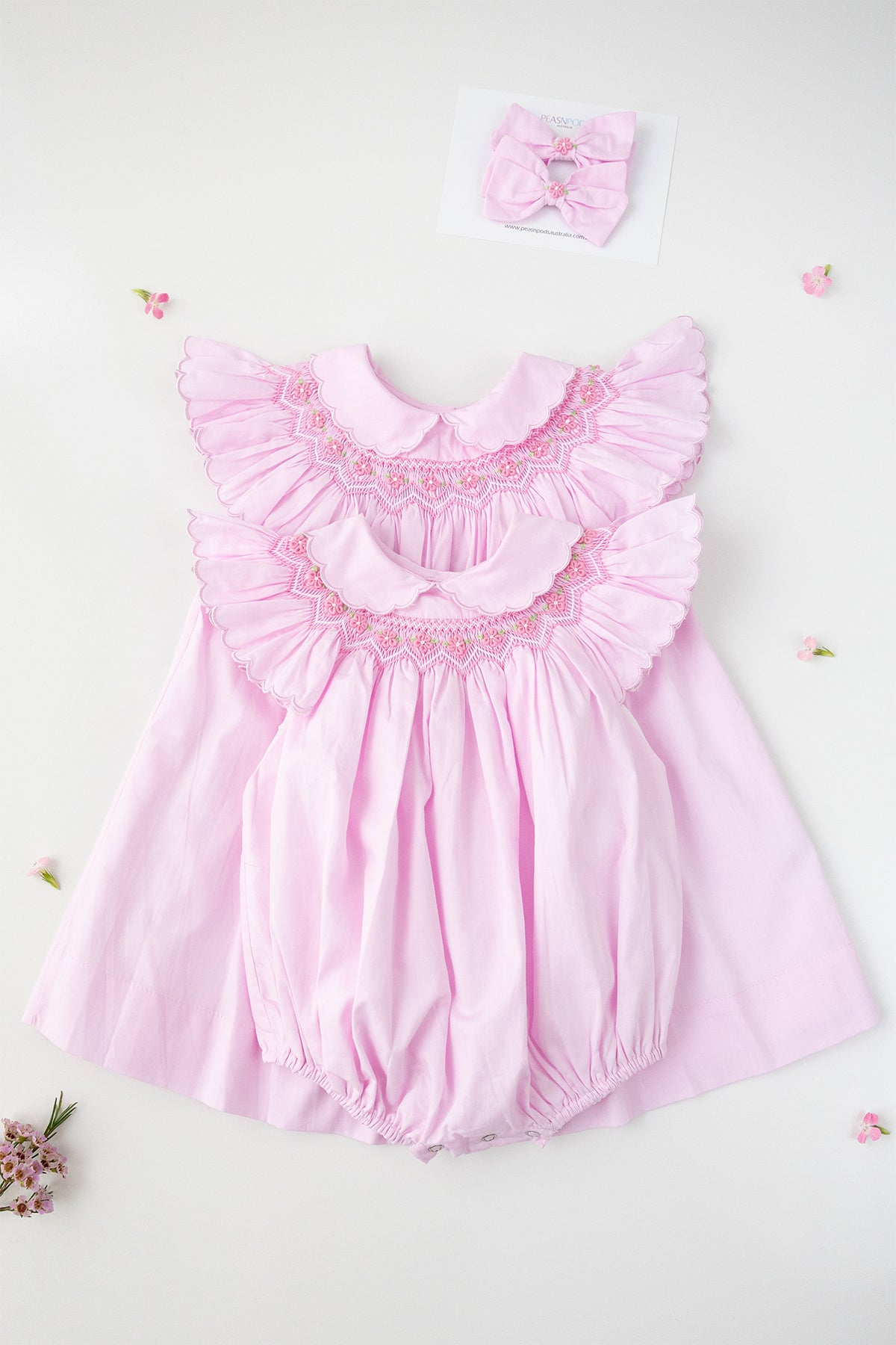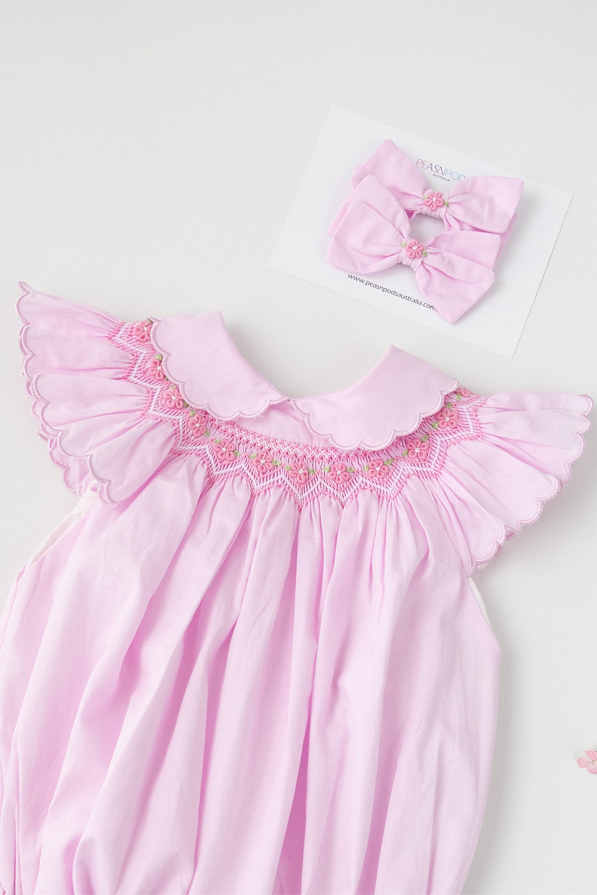 Handcrafted Excellence: It's important to note that every Peasnpodsaustralia garment is lovingly handcrafted with intricate hand-smocking and hand-embroidery techniques. As a result, detailing and appliqué placement may vary slightly between pieces. This uniqueness is not considered a defect but rather a beautiful hallmark of hand-crafted goods.