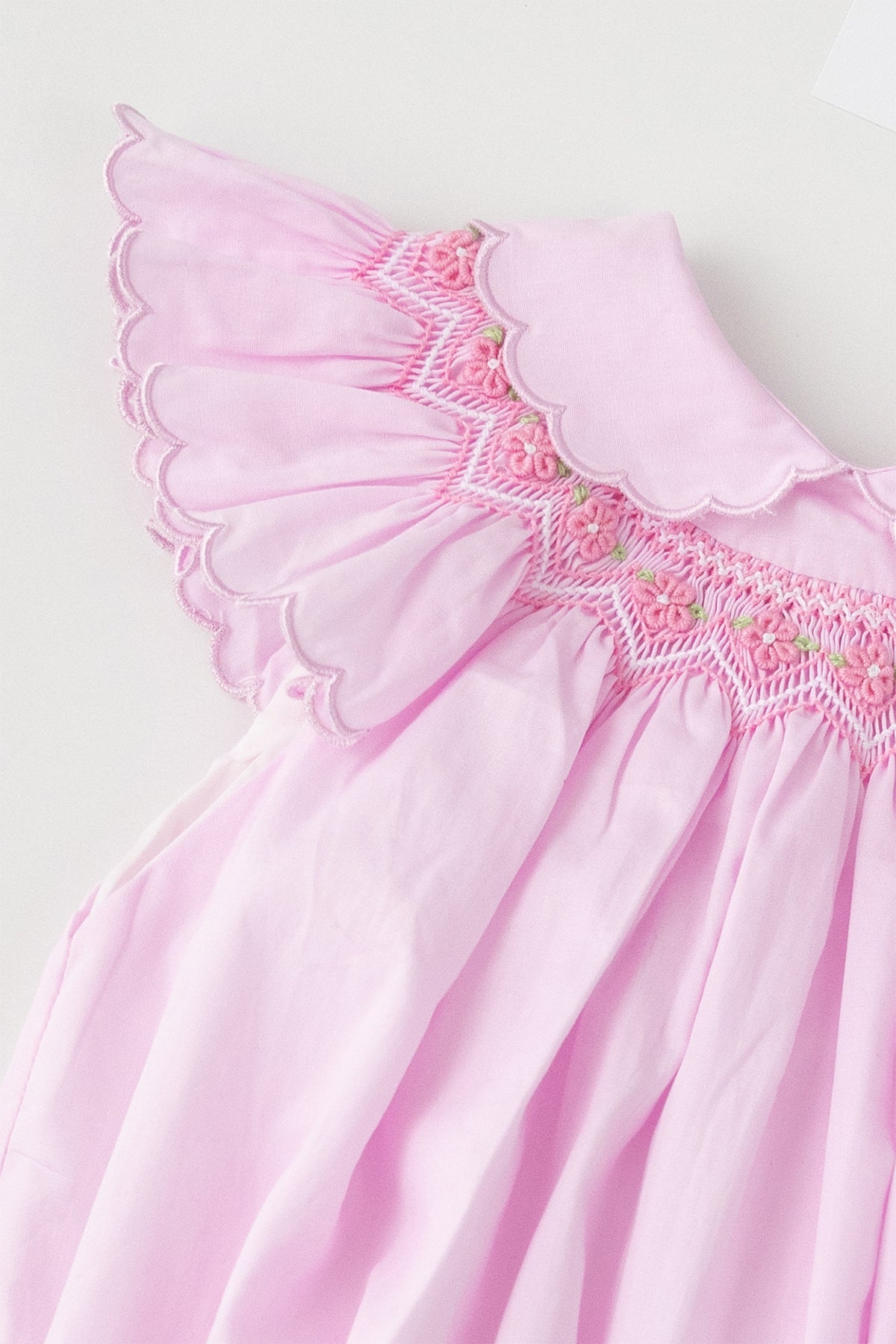 The Rosie Bishop romper features a traditional bishop silhouette with handsmocking across the neckline. The neckline includes detailed flower embroidery that complements the smocking. The collar and sleeves are finished with scallop embroidery. The dress fastens at the back with mother-of-pearl buttons and is fully lined to ensure comfort and ease of wear.