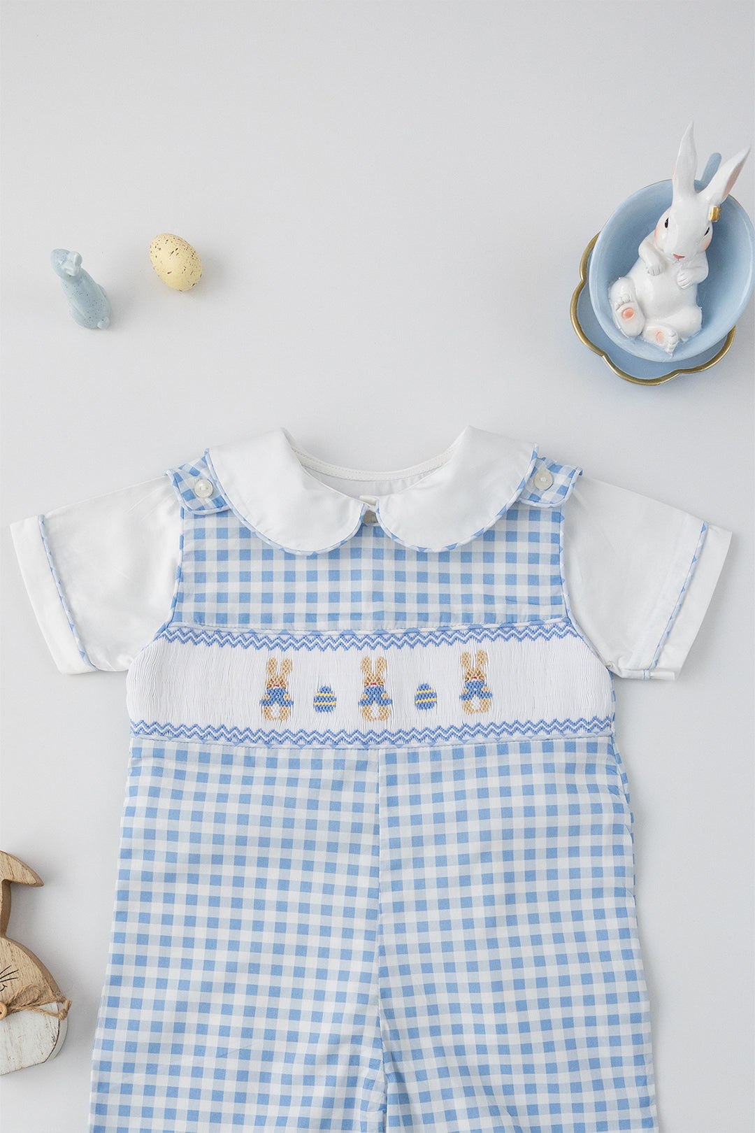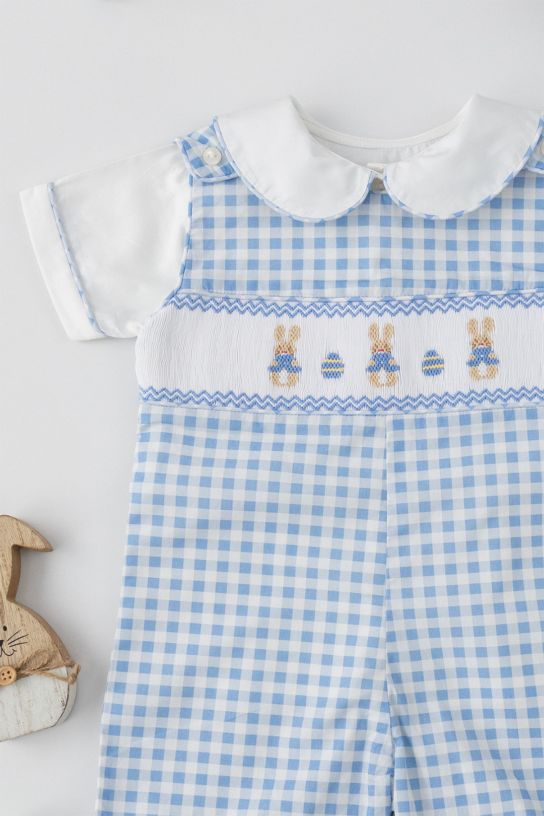 This timeless Jon Jon features three handsmocked bunnies across the bodice, beautifully complemented by two delicately smocked Easter eggs for touch of seasonal charm. Each detail is carefully stitched, creating a design that feels playful.