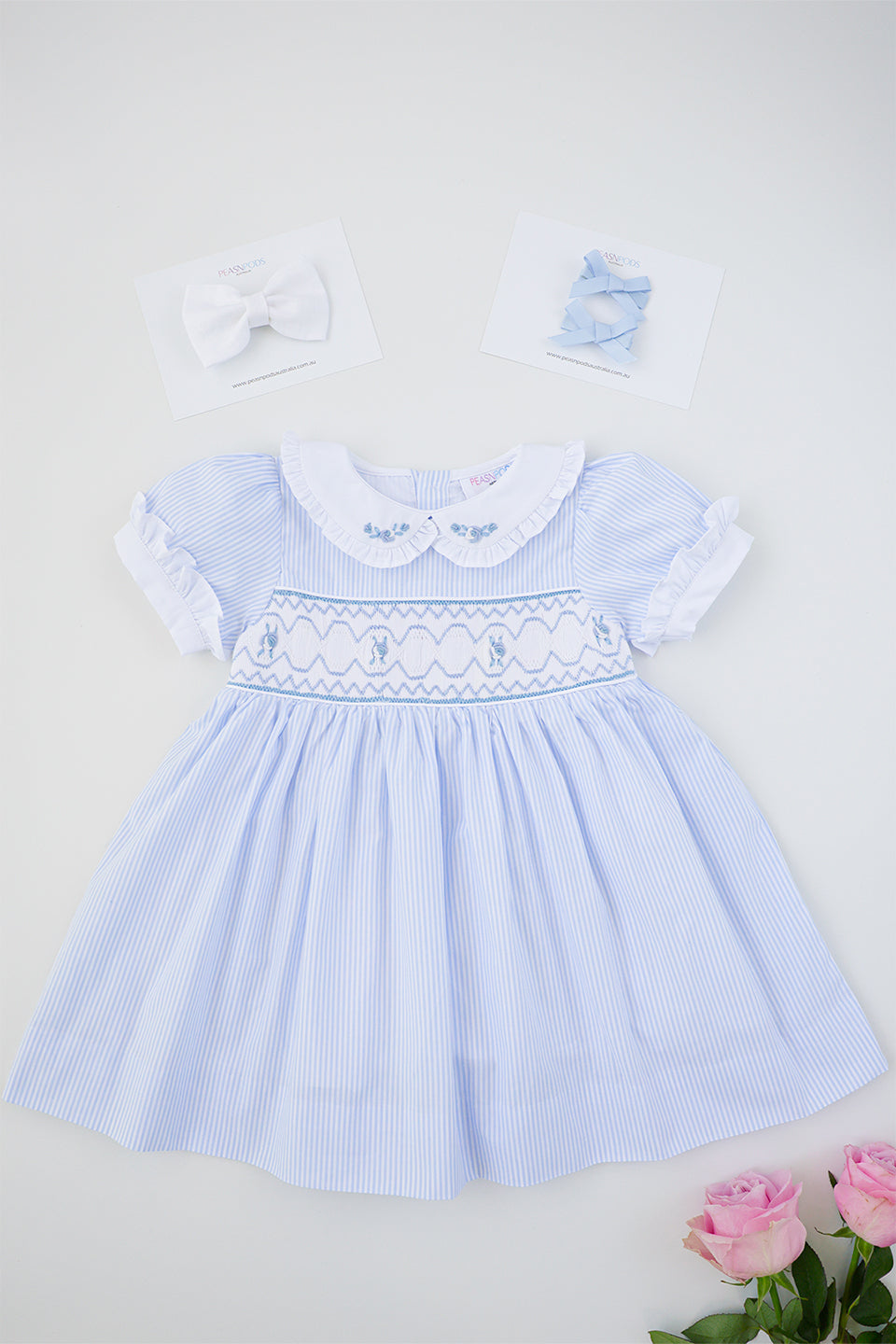 The Bluebell Handsmocked Dress is a sweet and timeless style in soft blue stripe fabric. It features a classic white Peter Pan collar with a gentle frill and floral embroidery, paired with a geometric handsmocked panel finished with delicate rose floral details. White piping above and below the smocking and around the waist adds a lovely finishing touch. Puff sleeves with white cuffs and soft frill detailing complete the look. Fully lined for comfort, this dress is perfect for both special moments and everyday wear, and pairs beautifully with the matching Bluebell Bubble Romper and Little Sailor Jon Jon Set.