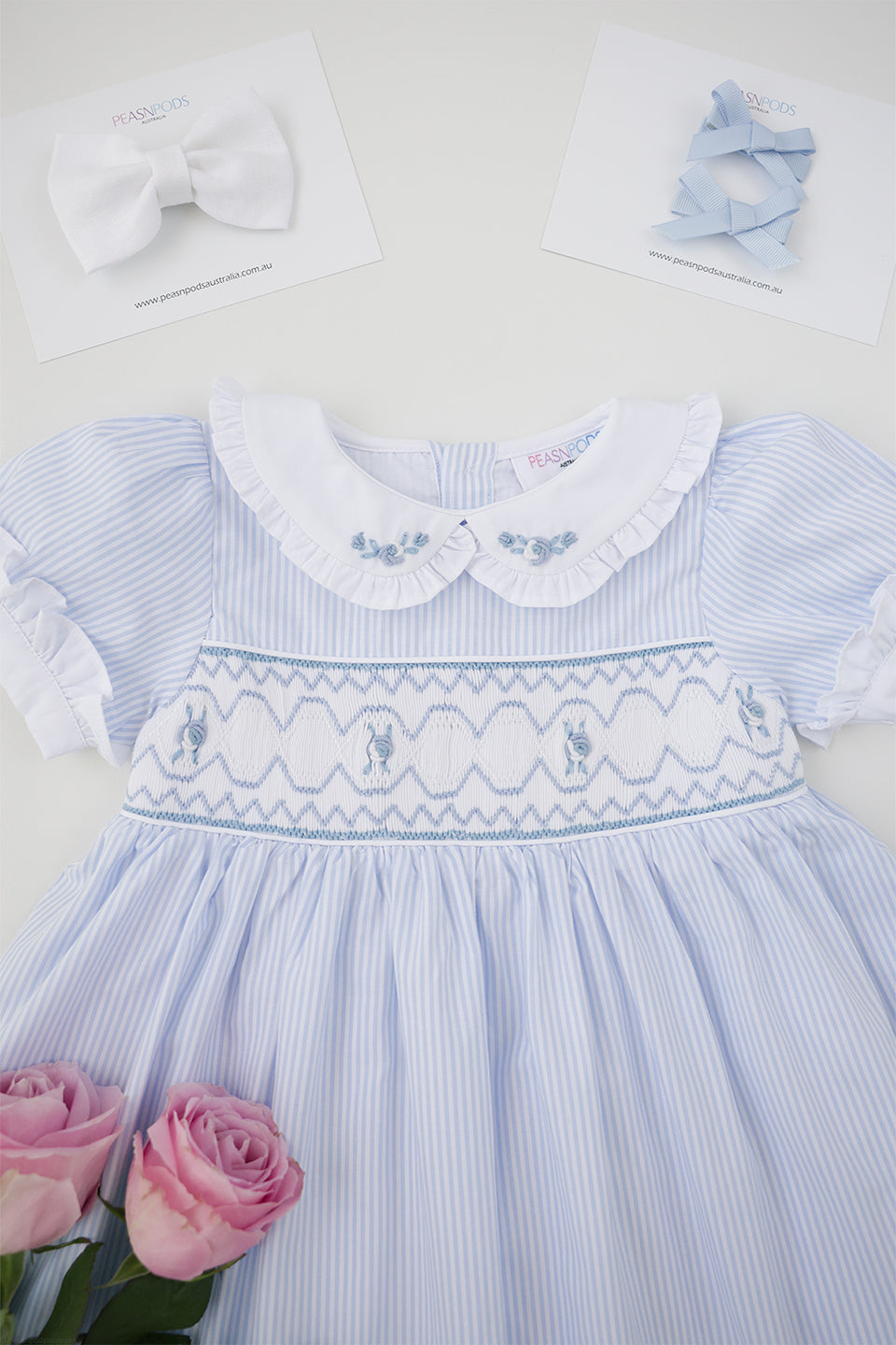 Handcrafted Excellence: It's important to note that every Peasnpodsaustralia garment is lovingly handcrafted with intricate hand-smocking and hand-embroidery techniques. As a result, detailing and appliqué placement may vary slightly between pieces. This uniqueness is not considered a defect but rather a beautiful hallmark of hand-crafted goods.