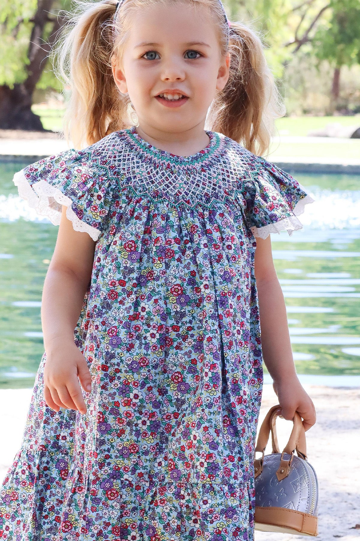 Blossom's Bishop Dress is a delightful celebration of colour and craftsmanship. Featuring a playful floral print, this dress brings together vibrant hues with a fully hand smocked neckline that adds an elegant, handcrafted touch. Delicate cotton trim on the flutter sleeves and a full frill along the hem lend a charming finish, while the soft cotton lining ensures comfort.